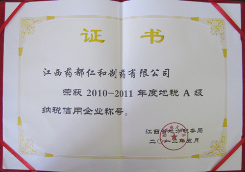公司獲江西省地稅“A級納稅信用企業(yè)”稱號
